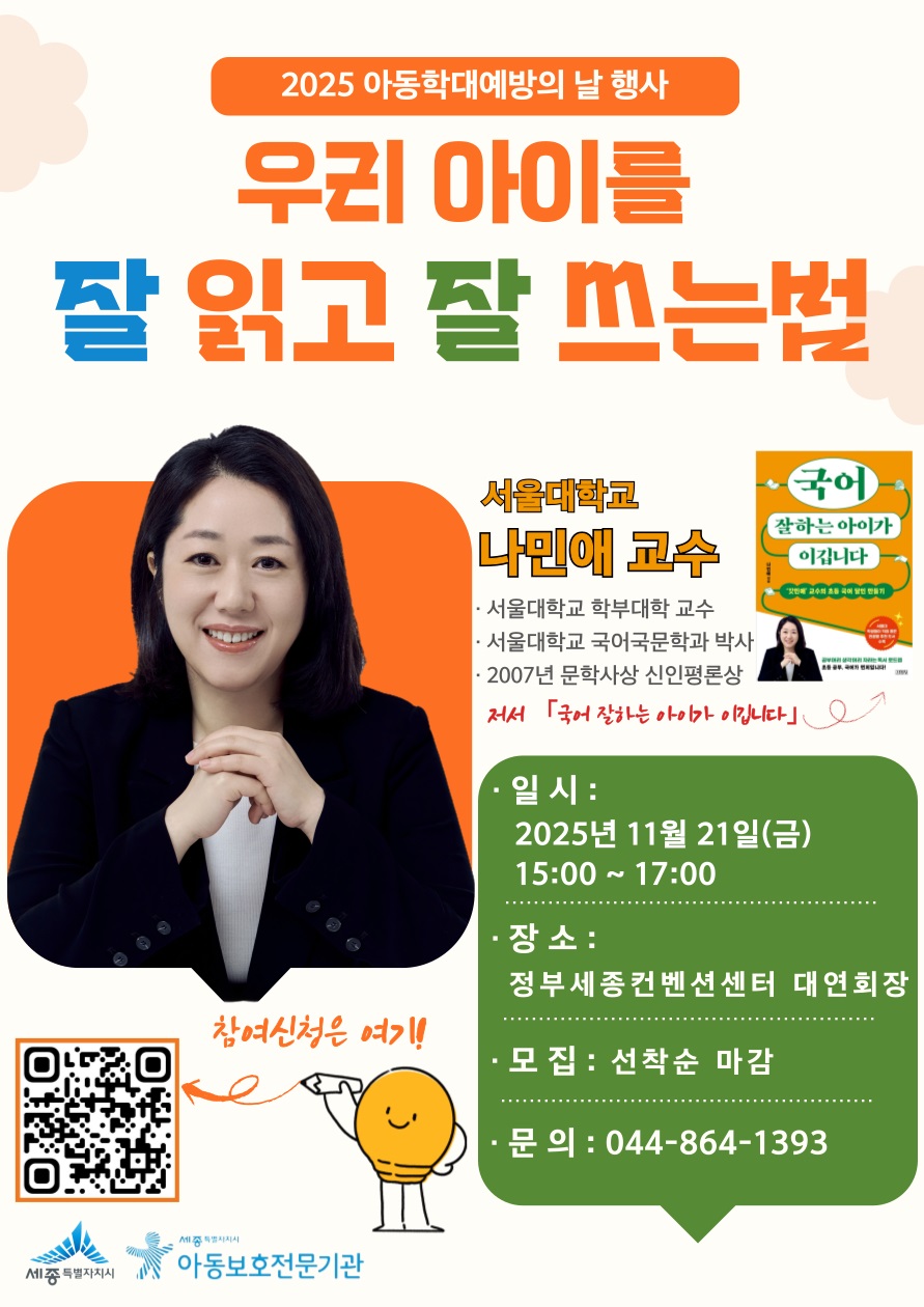 가. 행 사 명 : 2025 세종특별자치시 아동학대예방의 날 기념식 및 부모교육 나. 일 시 : 2025. 11. 21.(금) 15:00~17:00 다. 장 소 : 정부세종컨벤션센터 대연회장 라. 교 육 : 우리 아이 잘 읽고 잘 쓰는 법(나민애 교수) 마. 대 상 : 세종시민 250명 바. 신청기간 : 2025. 10. 15.부터 ~ 마감시까지(선착순 마감) 사. 접수방법 : 온라인 신청(홍보지 QR코드), 접속 링크(https://naver.me/GLzxlwzV)